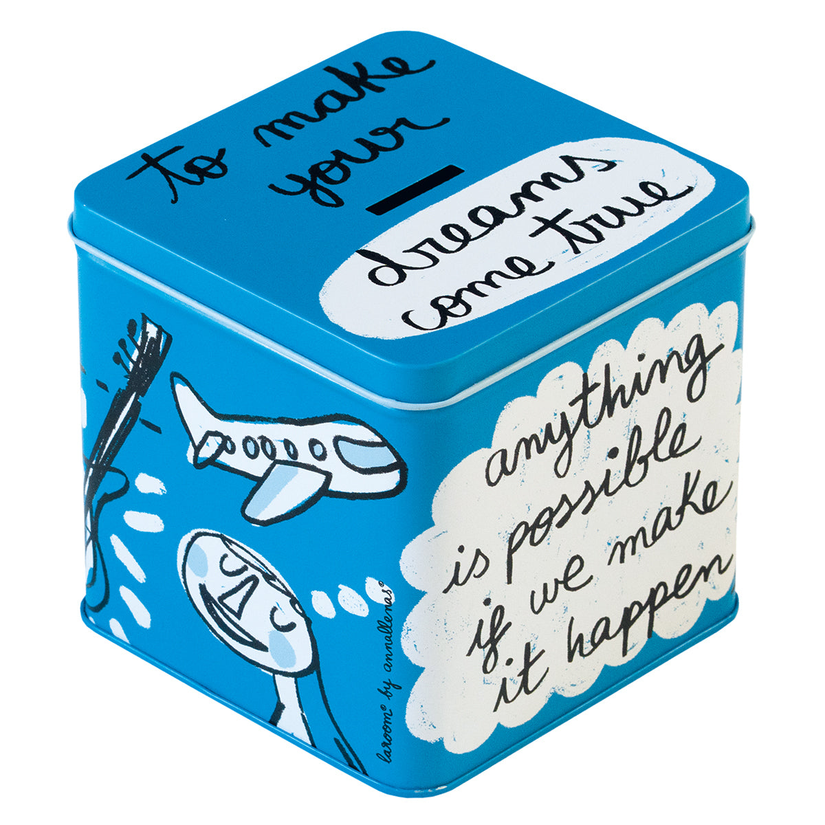 Boîte à monnaie en métal "pour réaliser vos rêves" bleu